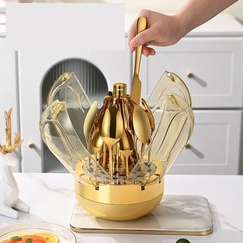 Ce présentoir à couverts de luxe incarne l'élégance moderne avec son design en forme de fleur et sa finition dorée haut de gamme.